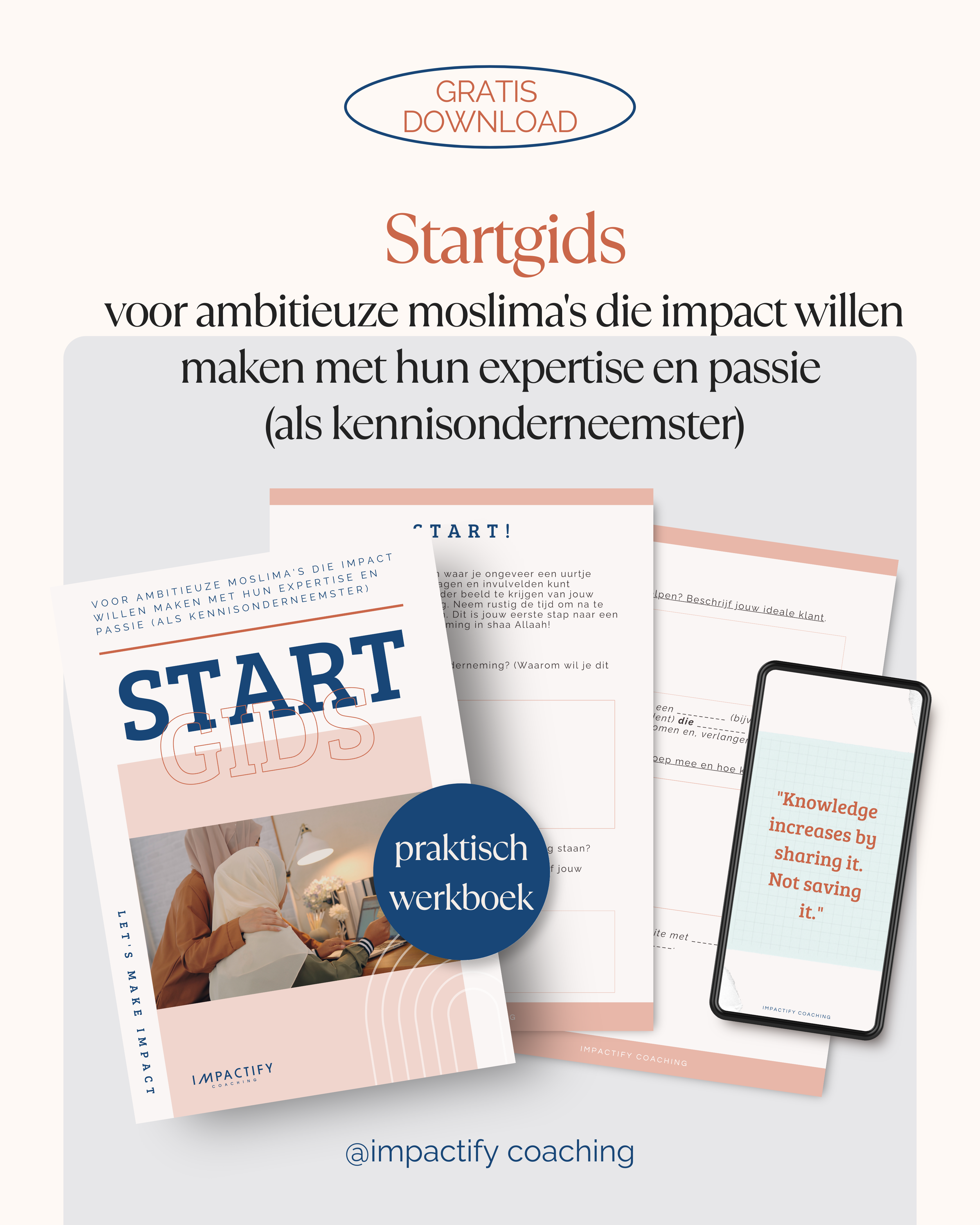 Maar... je weet niet zo goed waar en hoe je moet beginnen. Wat er allemaal bij komt kijken en hoe je alles kunt opzetten. Je voelt wel dat het nu tijd is om hiermee aan de slag te gaan. Laten we eerlijk zijn... de tijd vliegt voorbij en tijd is juist ons kostbaarste bezit. Elke seconde is een gunst... Hoe mooi is het om je tijd meer betekenis te geven door een schaalbare kennisonderneming in sha Allaah?